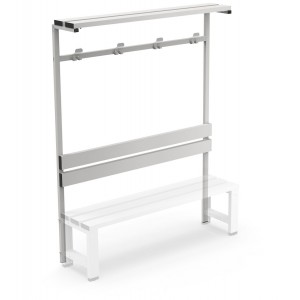 The frame is designed to enhance the functionality of the changing room bench, transforming it into a complete and well-organised solution. It consists of an ergonomic backrest, coat hooks and a shelf for organising clothing, shoes and other accessories. It is fastened directly to the bench legs by means of screws, ensuring secure installation and an extremely strong and stable structure over time.